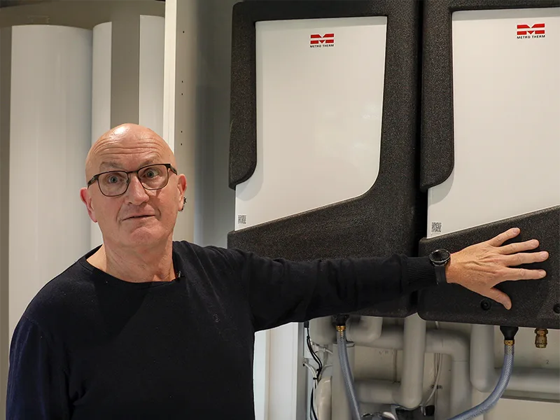 Vil du se Stig fortælle om huset, materialerne og energiløsningen? Se videoen fra besøget i Næstved og hør, hvordan to METRO Delta-varmepumper, vertikale jordvarmespiraler, ventilation med høj varmegenvinding og solceller er tænkt sammen i én samlet løsning.