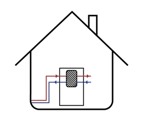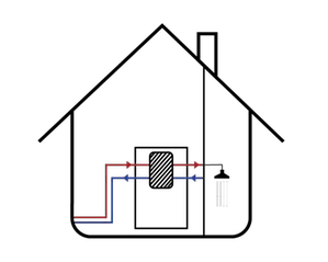 Det varme fjernvarmevand strømmer ind i brugsvandsveksleren fra fjernvarmenettet. Dette vand bruges som varmekilde men kommer aldrig i direkte kontakt med det vand, der skal bruges i boligen.