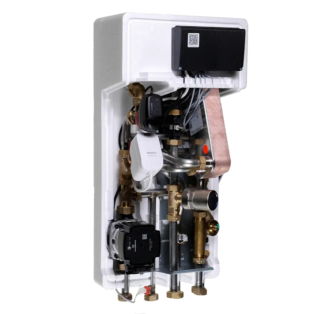 System 4 Slimline Mini S leverer op til 37 kW til brugsvand og 16,5 kW til rumvarme og er dimensioneret til både daglige behov og perioder med spidsbelastning. Unitten er desuden forberedt til installation af energimåler og leveres med integreret cirkulationspumpe, kontraventil og indbygget trykudligner. Det gør installationen hurtig og enkel uden behov for ekstra komponenter.