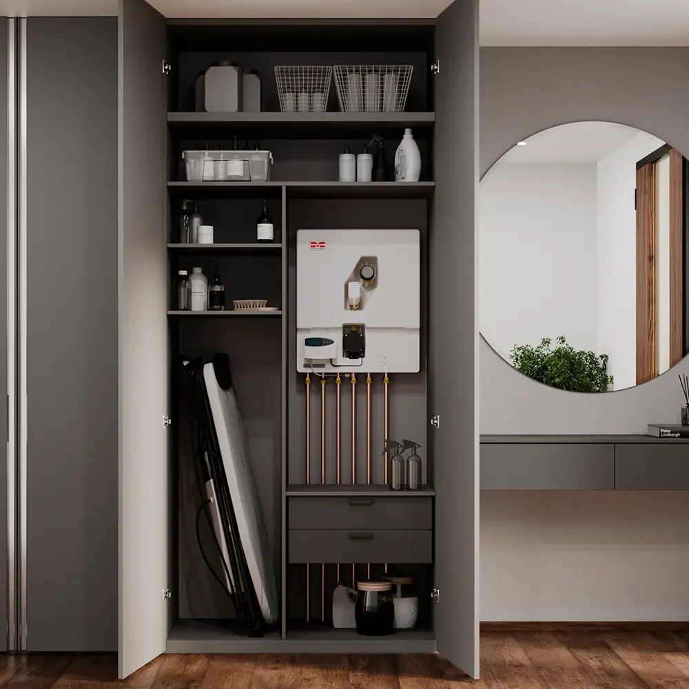 METRO System 4 Slimline S er velegnet til både helårsboliger og fritidsboliger. Den integrerede sommerfunktion slukker automatisk for varmekredsen, når der ikke er behov for rumopvarmning, hvilket reducerer energiforbruget i de varme måneder og gør unitten særligt attraktiv til sommerhuse og boliger med varierende brug.