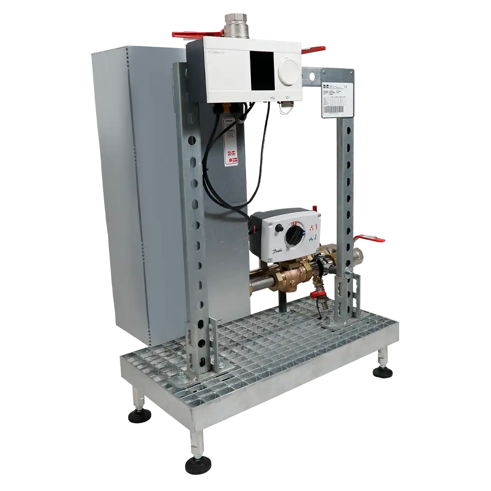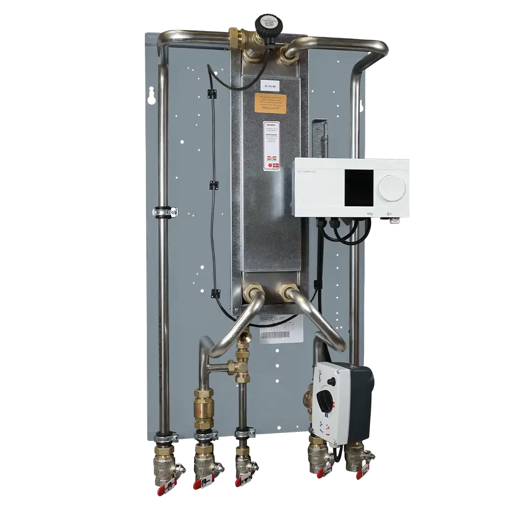 Vekslerstationen leveres som standard med den elektronisk styring ECL Comfort 210 fra Danfoss, som sikrer præcis regulering af brugsvandstemperaturen og en stabil varmtvandsforsyning – også ved spidsbelastning. Samtidig er løsningen forberedt med mulighed for brugsvandscirkulation, hvilket giver kort ventetid på varmt vand og høj komfort for slutbrugerne.