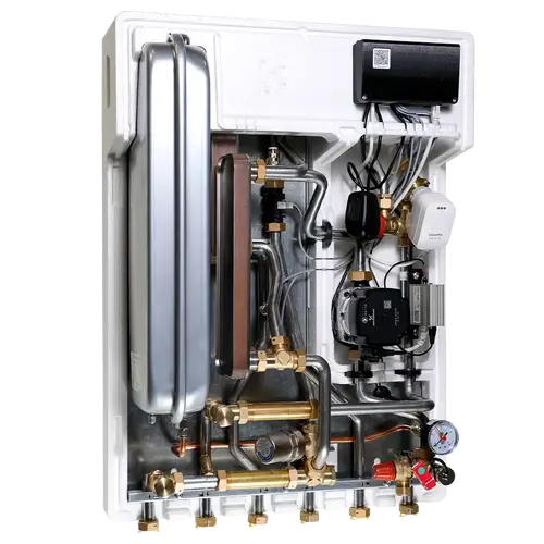 Brugsvandsreguleringen styres elektronisk via en hurtigtgående reguleringsventil, som sikrer en præcis og lynhurtig temperaturstyring for maksimal komfort i hverdagen. Samtidig er unitten udstyret med integreret trykekspansion, sikkerhedsventil og flowmåler, hvilket reducerer behovet for ekstra komponenter og gør installationen både hurtigere og mere overskuelig.