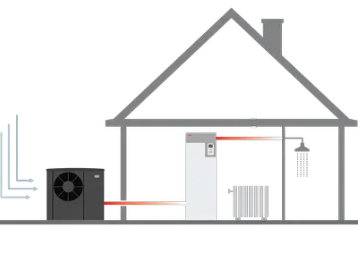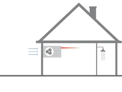 En luft til vand varmepumpe fra METRO THERM trækker varme ud af luften via dens store blæser, som – på trods af dens størrelse – stort set er lydløs. Energien transporteres via kølevæske videre til en indedel, som omdanner energien til varmt vand, der bliver sendt ud som rumvarme til boligens radiatorer eller gulvvarmerør.